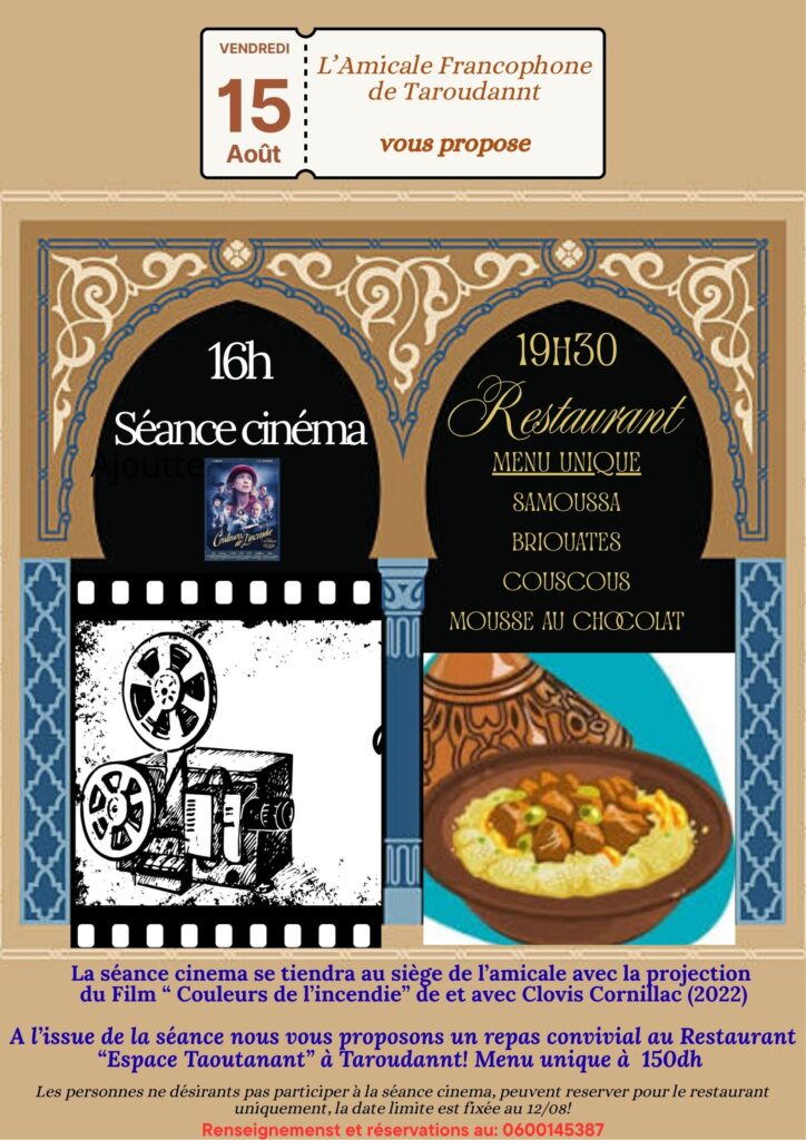 – A l’issu de la séance cinématographique du 15/08, un repas a été proposé au restaurant « Espace Taoutanant » chez Mohamed Ali. Menu unique complet a savoir: Entrée – Plat (couscous) – dessert 150dh! 12 personnes étaient présentes dans un cadre bucolique, sympathique et convivial.